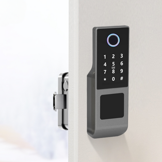Smart exterior door lock with dual fingerprint entry (entry and exit), password and card, and Tuya Wi-Fi system.