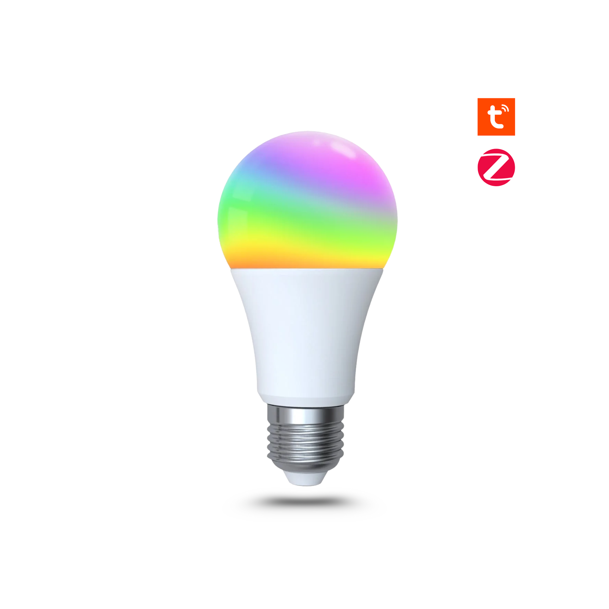 مصباح LED بقاعدة E27 يعمل عبر بروتوكول Zigbee (يتطلّب Hub)، يدعم 16 مليون لون مع الأبيض الدافئ–البارد 2700–6500K، خافت 1–100%، وتحكّم من تطبيق Tuya/Smart Life.