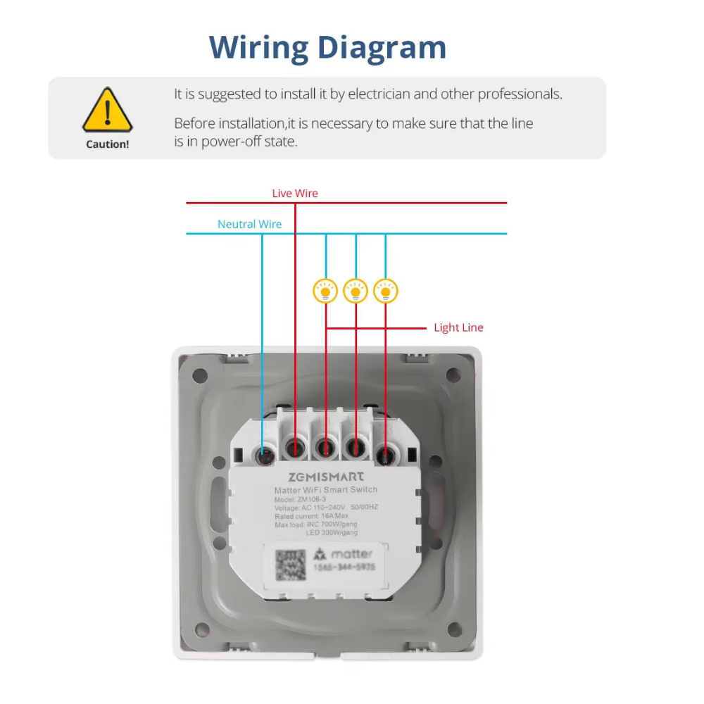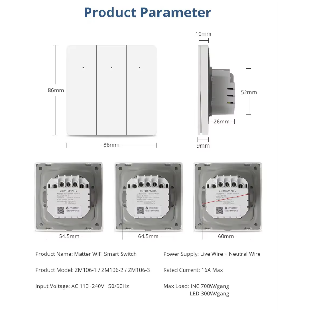 مفتاح جدار ذكي WiFi يعمل بتقنية Matter من Zemismart – أوروبي، 1/2/3 أزرار