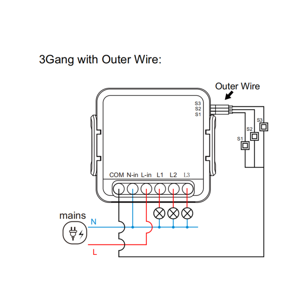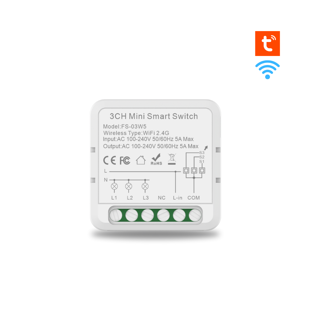 يتكون جهاز Mini Smart Switch 3CH من وحدة ذكية صغيرة للتحكم في الإضاءة أو الأحمال الكهربائية عبر تطبيق الهاتف والإنترنت اللاسلكي. يتميز التصميم الصغير بإمكانية تركيبه داخل علبة التوصيل أو خلف مفتاح تقليدي دون الحاجة إلى تغيير اللوحة الخارجية، ويتيح التحكم عن بُعد والتحكم الصوتي عبر المساعدات الذكية مثل أمازون أليكسا وجوجل أسيستنت. توفر الوحدة ثلاث قنوات (3CH) مما يسمح بتوصيل ثلاثة دوائر تحكم منفصلة من خلال جهاز واحد.