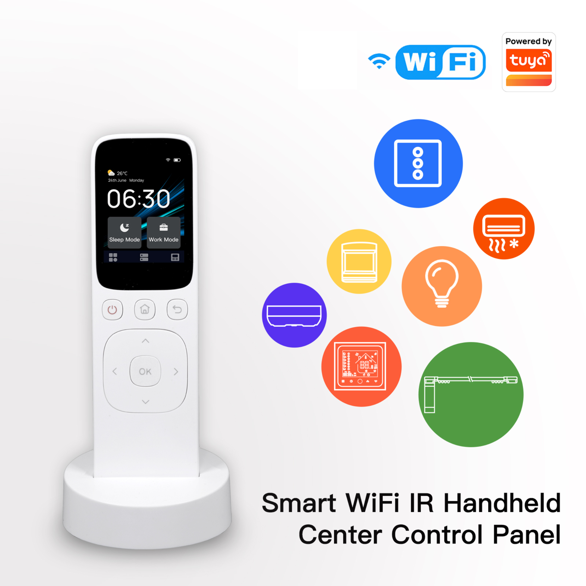 لوحة تحكم محمولة تعمل عبر Wi-Fi مع شاشة لمس، تدمج التحكم بالأجهزة الذكية وتفعيل المشاهد بضغطة واحدة، بالإضافة إلى IR للتحكم بالتلفاز والمكيّف وغيره.