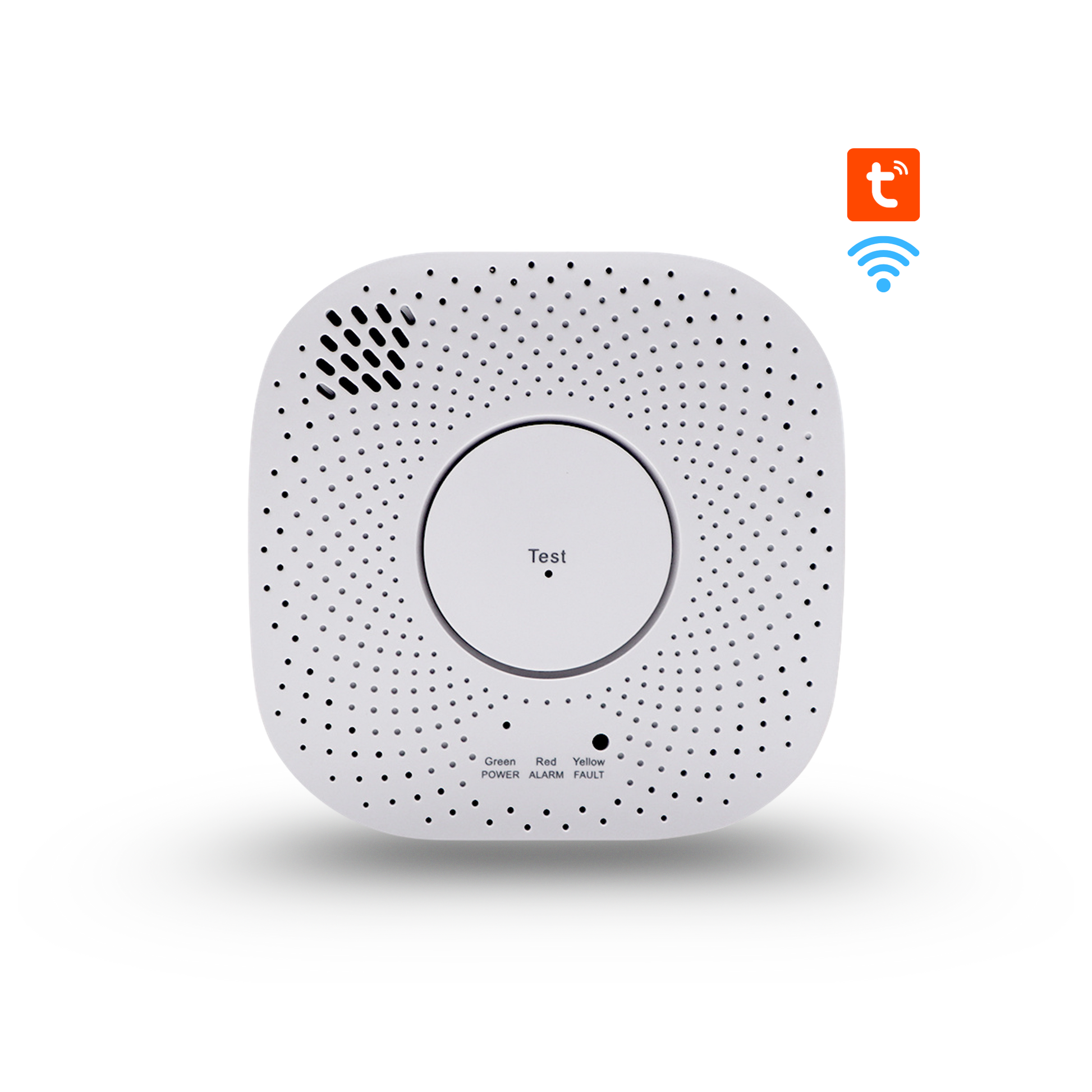 - زر الاختبار: ضغطة قصيرة لاختبار الصوت والضوء، وضغط مطوّل (~8 ثوانٍ) لقطع الصمام يدويًا لاختبار الربط.