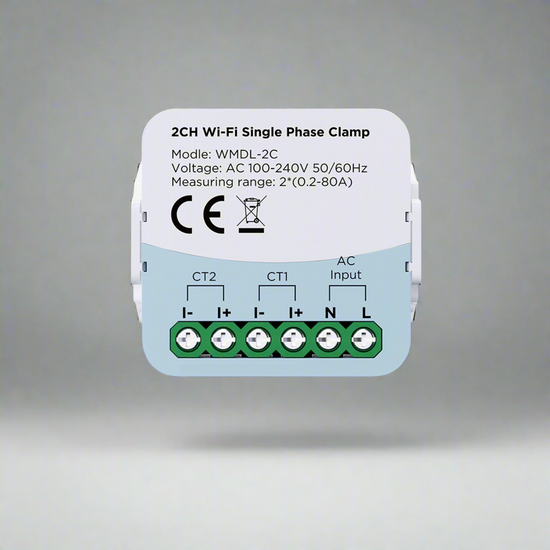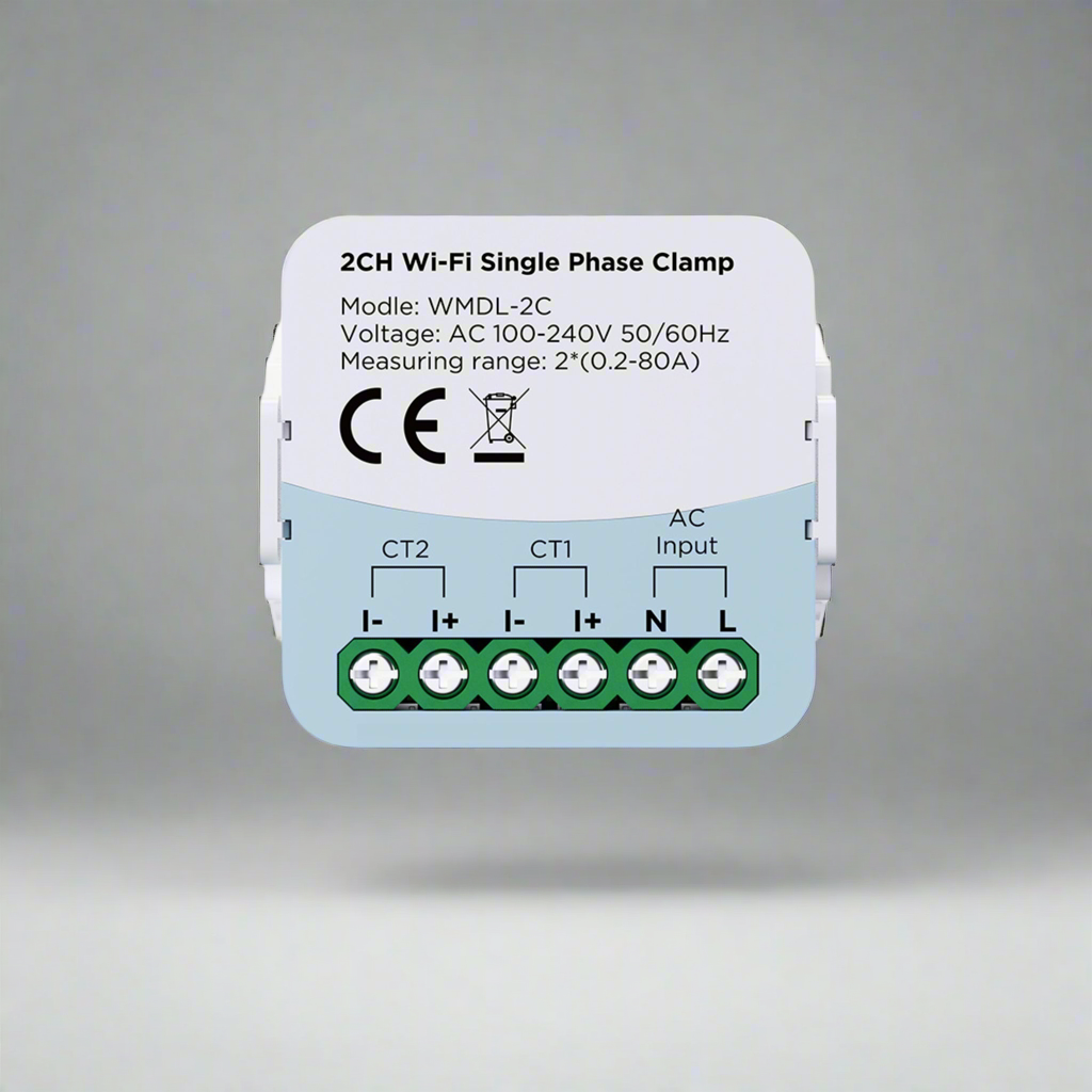 مراقب طاقة ذكي Wi-Fi + BLE أحادي الطور – مشابك CT مزدوجة 2×80A (WMDL-2C)