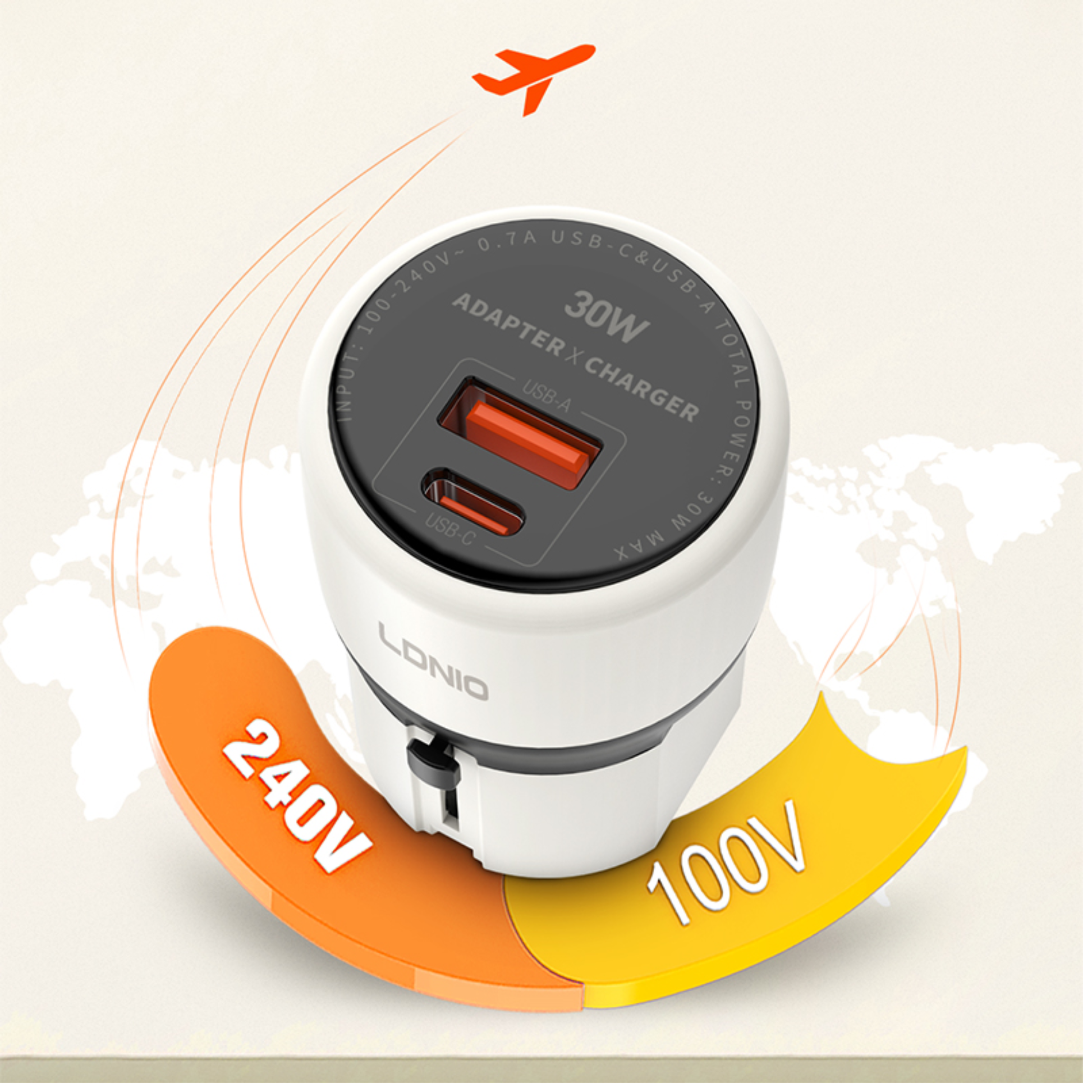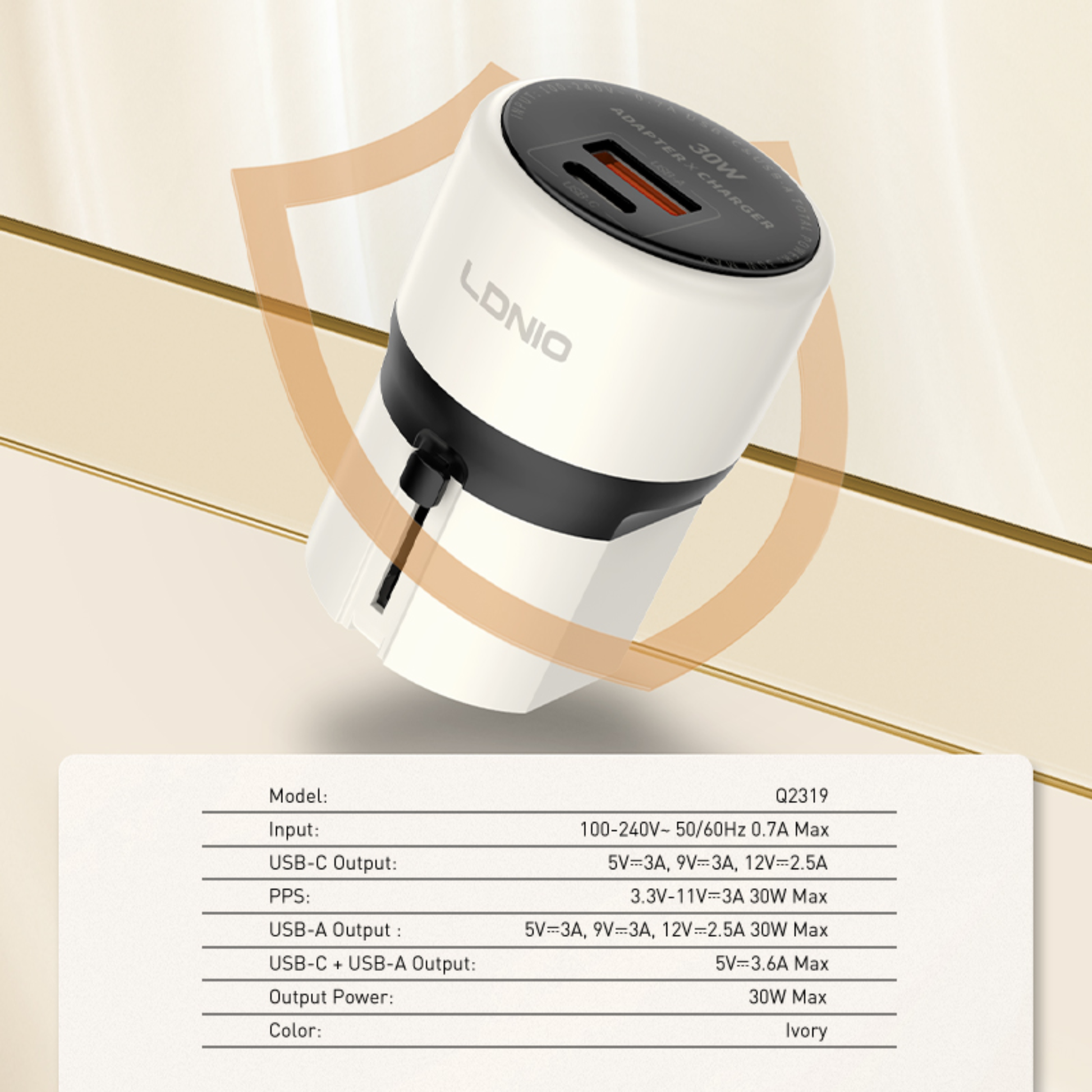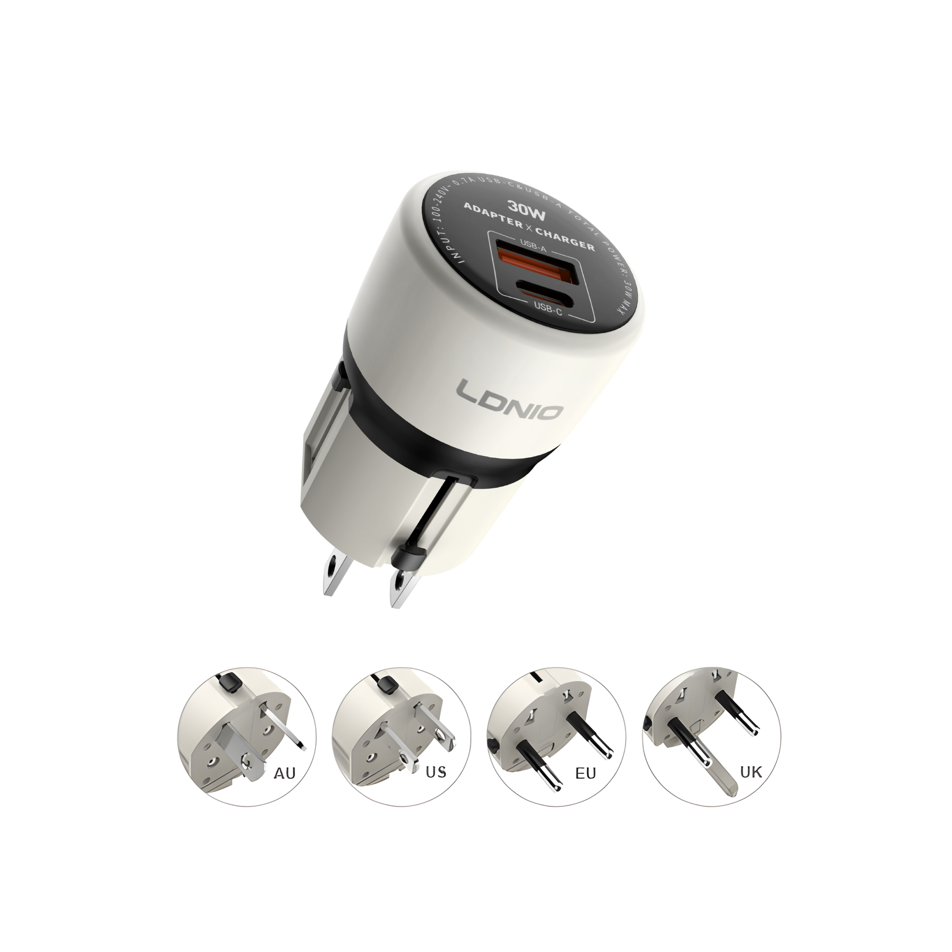 شاحن سفر عالمي LDNIO Q2319 – قدرة 30 واط بتقنية GaN مع منفذي USB-C + USB-A
