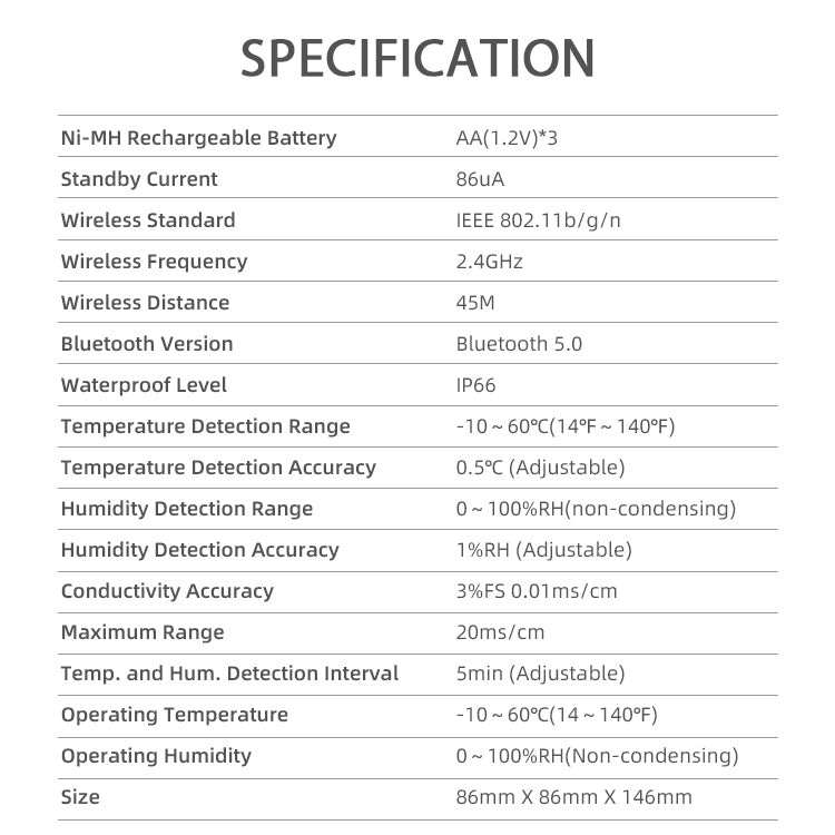 - مدى قياس الحرارة: -10~60℃ (14℉~140℉) بدقة ±0.5℃