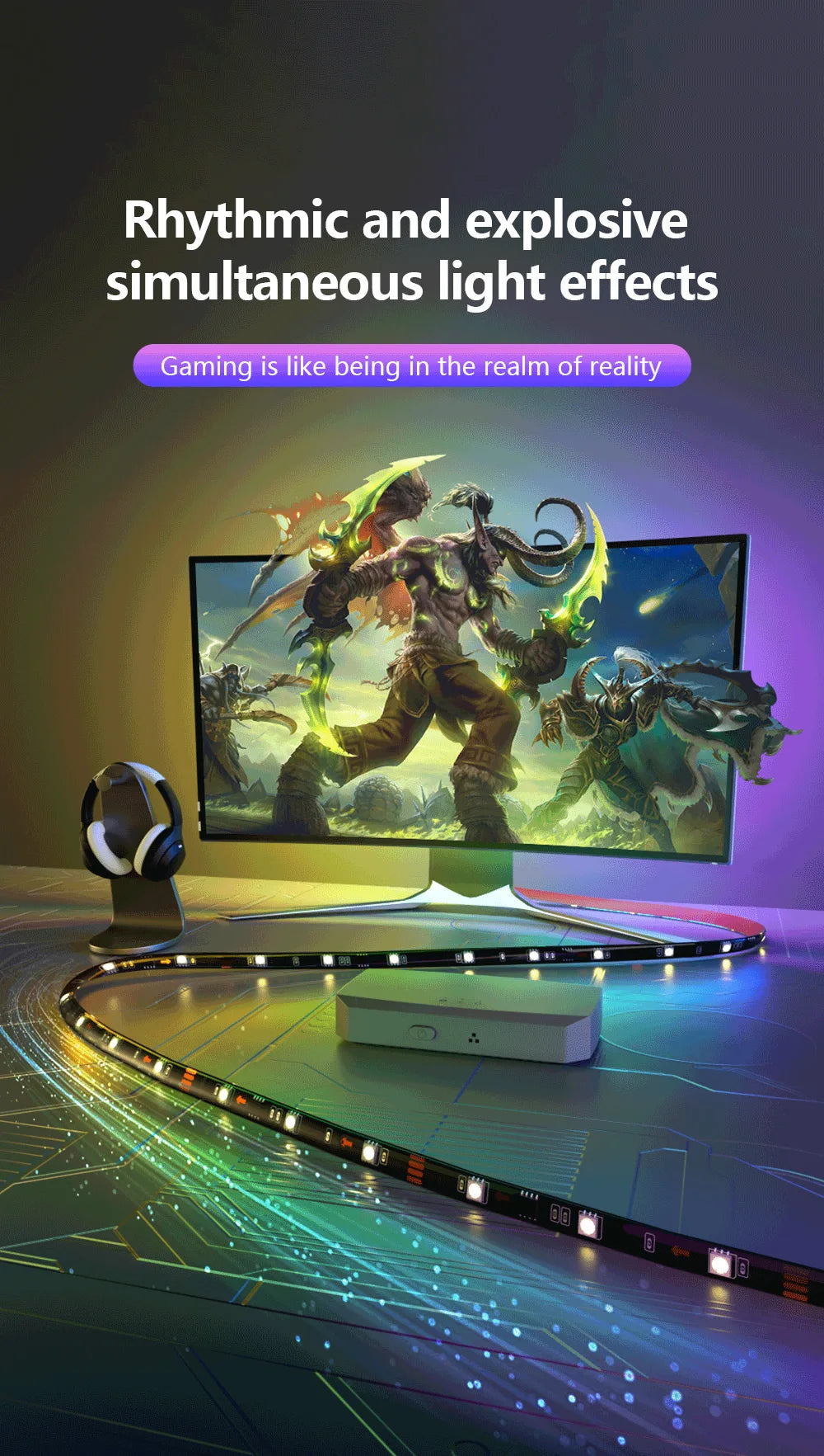 حول غرفة معيشتك إلى سينما منزلية حقيقية. يقوم هذا النظام الذكي بتحليل ألوان المحتوى المعروض على شاشتك في الوقت الفعلي عبر صندوق المزامنة (HDMI Box)، وعكسها فوراً على شريط الإضاءة الخلفي، مما يخلق تجربة انغماس بصري تتجاوز حدود إطار التلفاز.