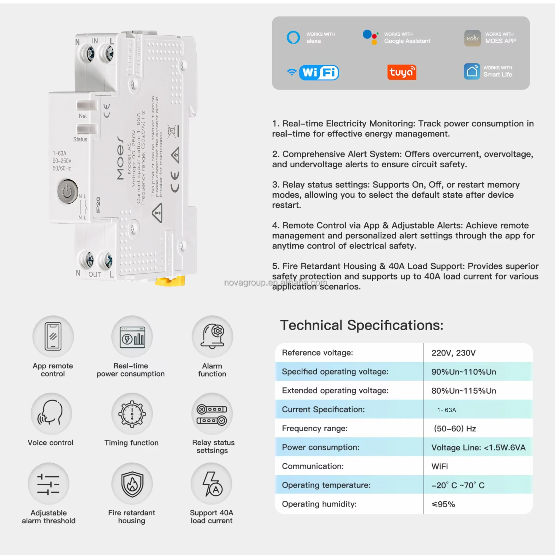 Wi-Fi 2.4GHz Tuya / Smart Life 1–63A قابل للضبط قياس طاقة لحظي جدولة + شروق/غروب Alexa / Google