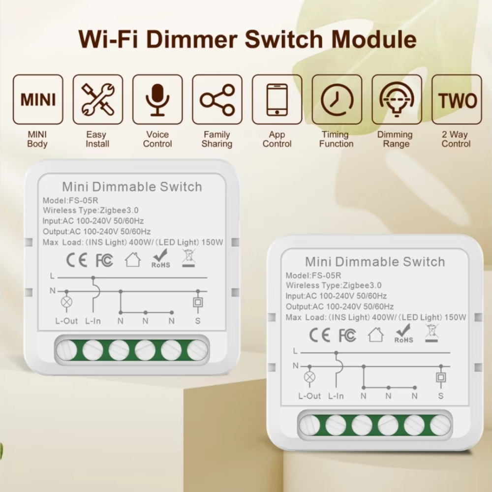 مفتاح تعتيم ذكي صغير وايفاي مع دعم Alexa وTuya – تحكم لاسلكي بالإضاءة وتوقيت ذكي