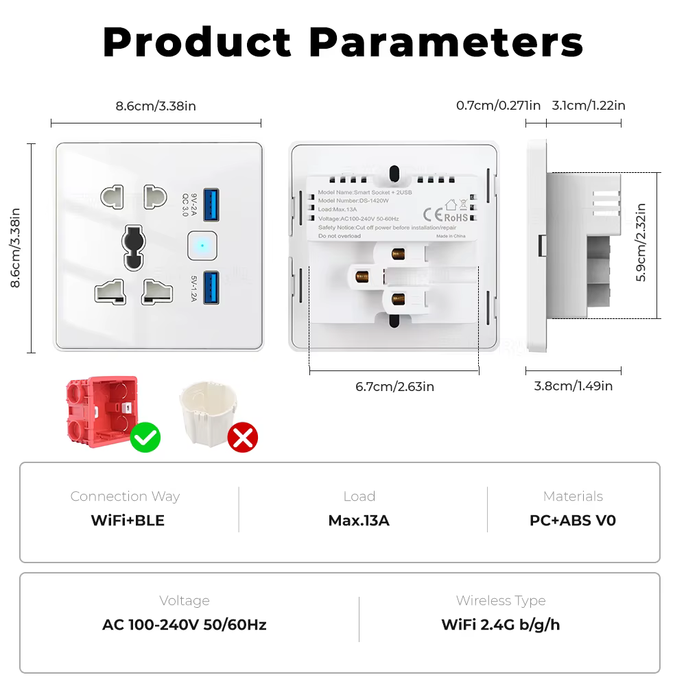 - التركيب: يتطلب علبة تثبيت مربعة 86×86 مم (لا يدعم العلب الدائرية)