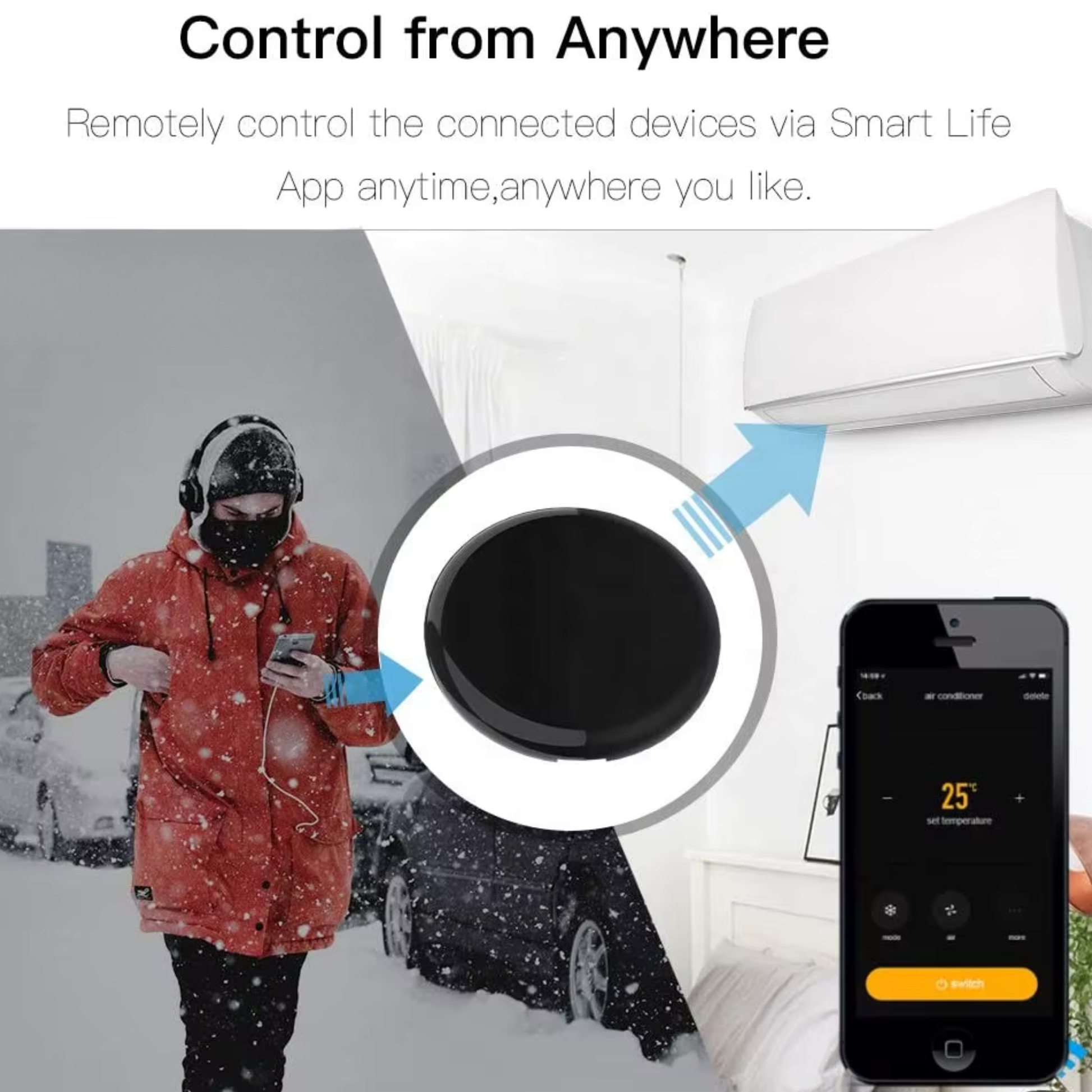 - تحكم شامل عبر التطبيق: استخدم تطبيق (Smart Life) أو (Tuya Smart) للتحكم في مكيف الهواء وتشغيل التلفزيون وتغيير القنوات حتى وأنت خارج المنزل.
