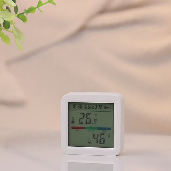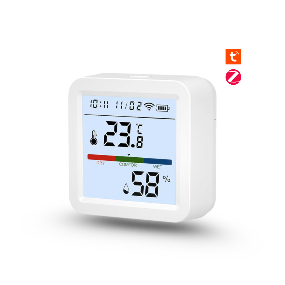 راقب الجو الداخلي بدقة وفعالية مع مستشعر ZigBee 3.0 المزود بشاشة LCD واضحة وإضاءة خلفية. يعرض حالة الرطوبة (جاف / مريح / رطب) فورًا، ويُسجّل القراءات في التطبيق برسوم بيانية، مع إمكانية الربط الذكي لتشغيل المكيف أو جهاز التدفئة تلقائيًا حسب القيم.