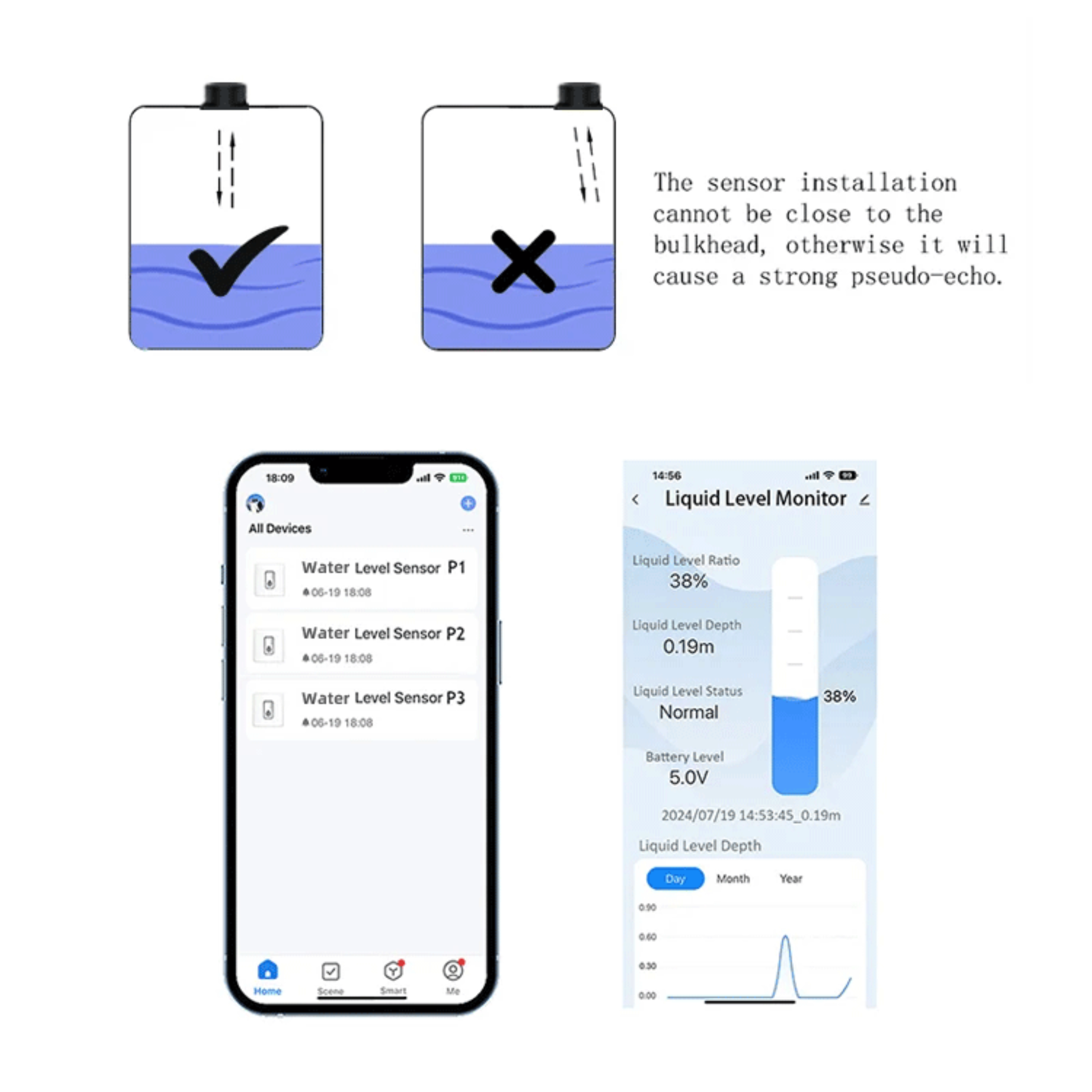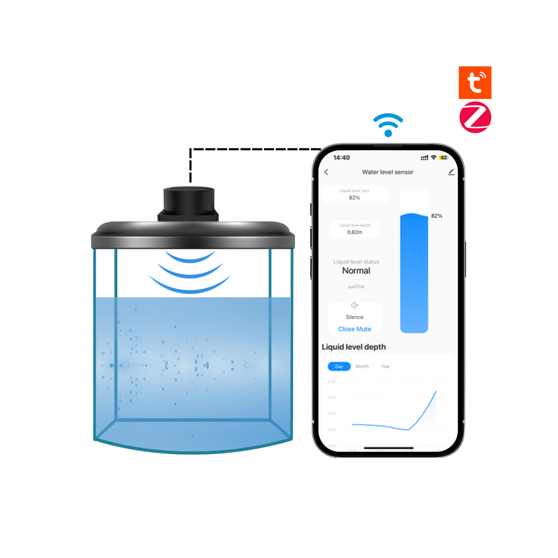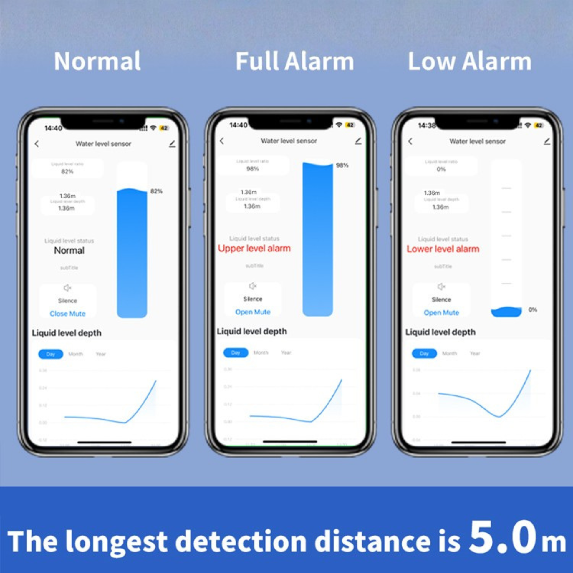 راقب مستوى الماء/السائل داخل الخزان مباشرة من تطبيق Tuya Smart / Smart Life مع تنبيهات ارتفاع/انخفاض المستوى، ومدى قياس يصل إلى 5 متر.