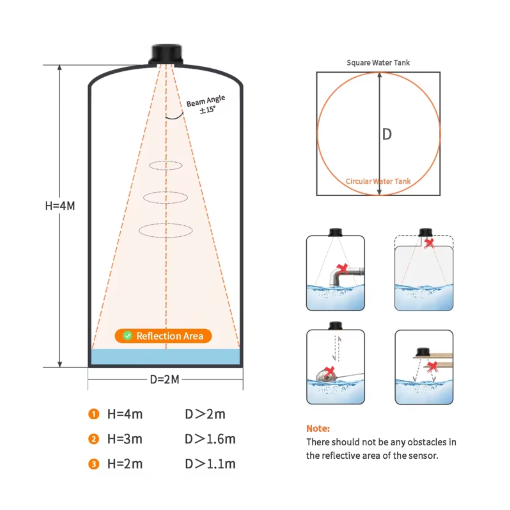 زاوية الإرسال تقريبًا ±15°؛ لذلك لازم يكون سطح الماء ضمن مخروط الإرسال بدون عوائق.