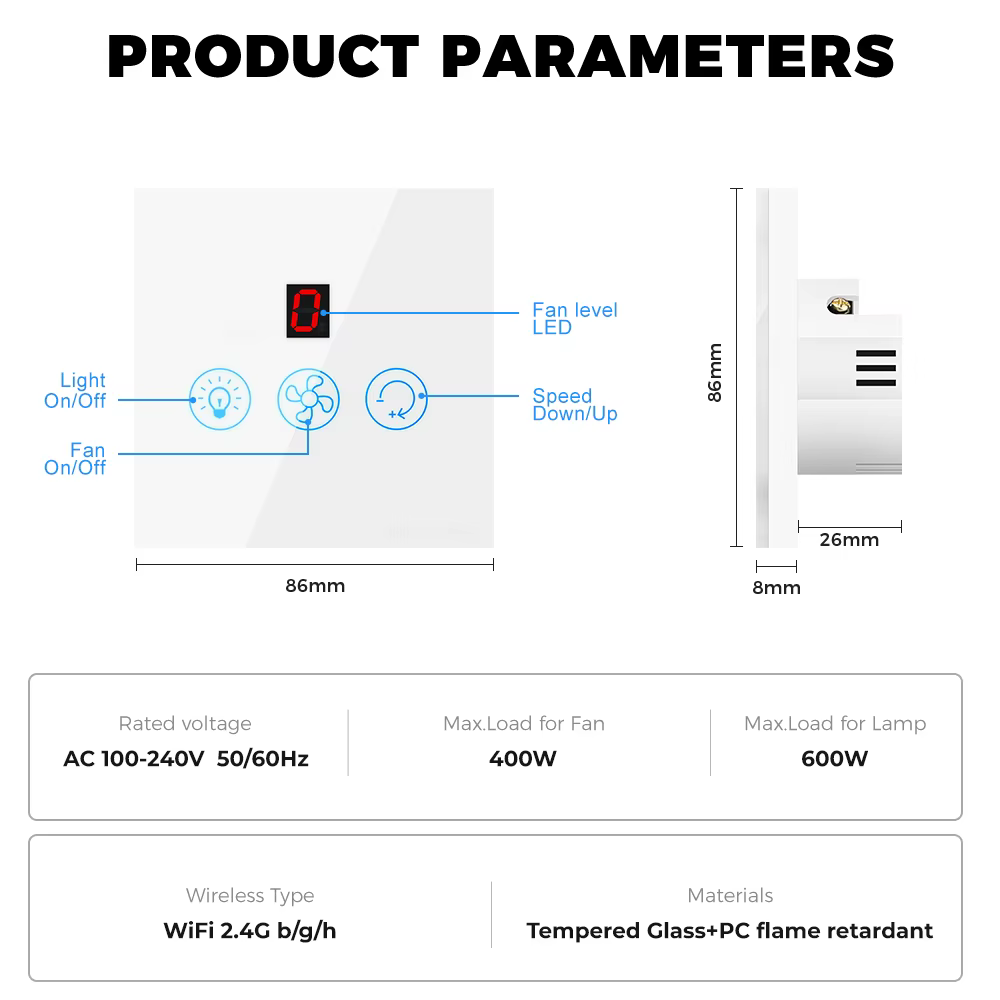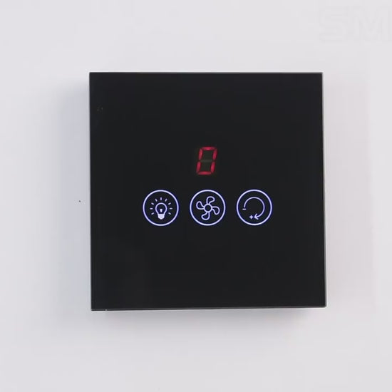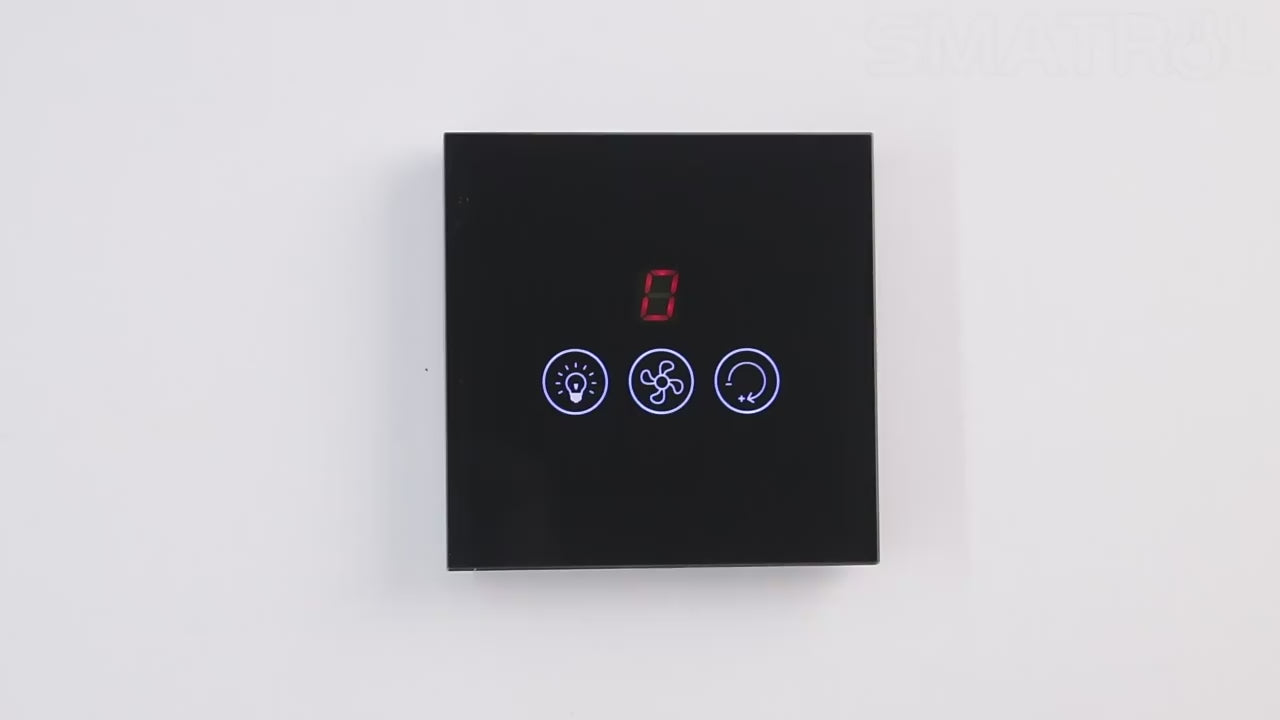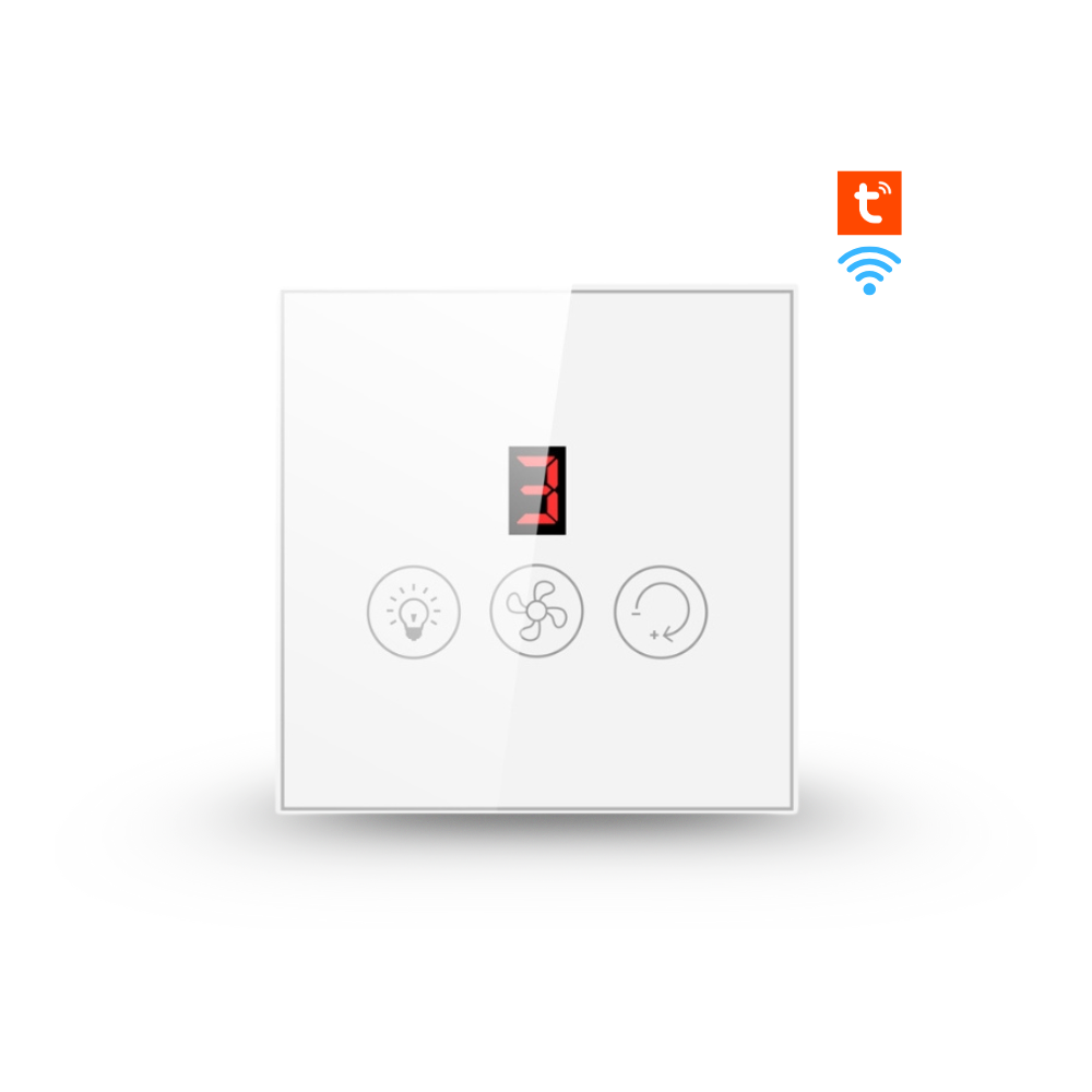 حوّل مروحة السقف لديك إلى نظام ذكي كامل عبر مفتاح جداري أنيق بواجهة لمس وزجاج مقوى وشاشة LED لعرض مستوى السرعة. تحكم بالمروحة والمصباح من نفس المفتاح عبر التطبيق أو الأوامر الصوتية (Amazon Alexa وGoogle Home).