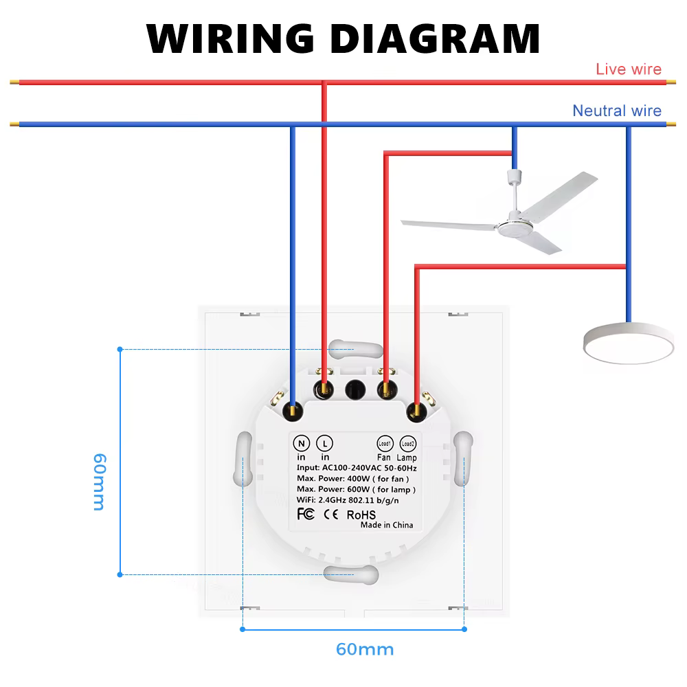 - تحكم مزدوج: تشغيل/إيقاف المروحة والمصباح من نفس اللوحة.